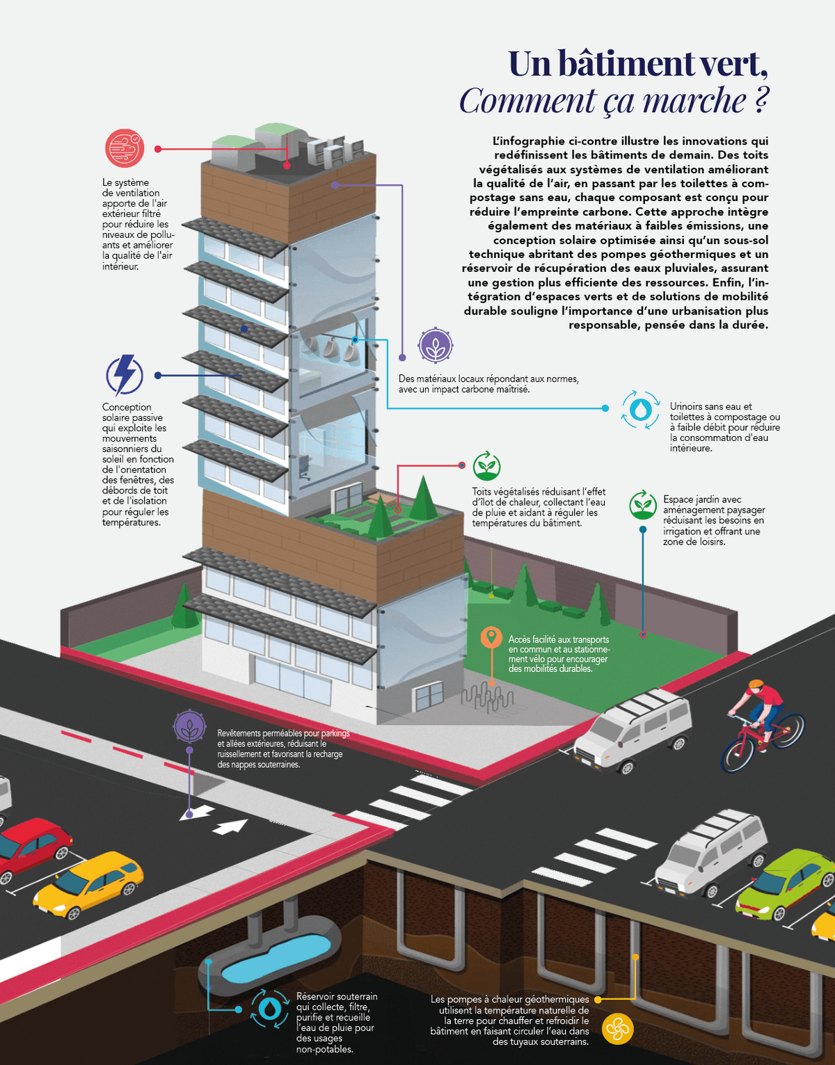 L’infographie ci-contre illustre les innovations qui redéfinissent les bâtiments de demain. Des toits végétalisés aux systèmes de ventilation améliorant la qualité de l’air, en passant par les toilettes à compostage sans eau, chaque composant est conçu pour réduire l’empreinte carbone. Cette approche intègre également des matériaux à faibles émissions, une conception solaire optimisée ainsi qu’un sous-sol technique abritant des pompes géothermiques et un réservoir de récupération des eaux pluviales, assurant une gestion plus efficiente des ressources. Enfin, l’intégration d’espaces verts et de solutions de mobilité durable souligne l’importance d’une urbanisation plus responsable, pensée dans la durée.
