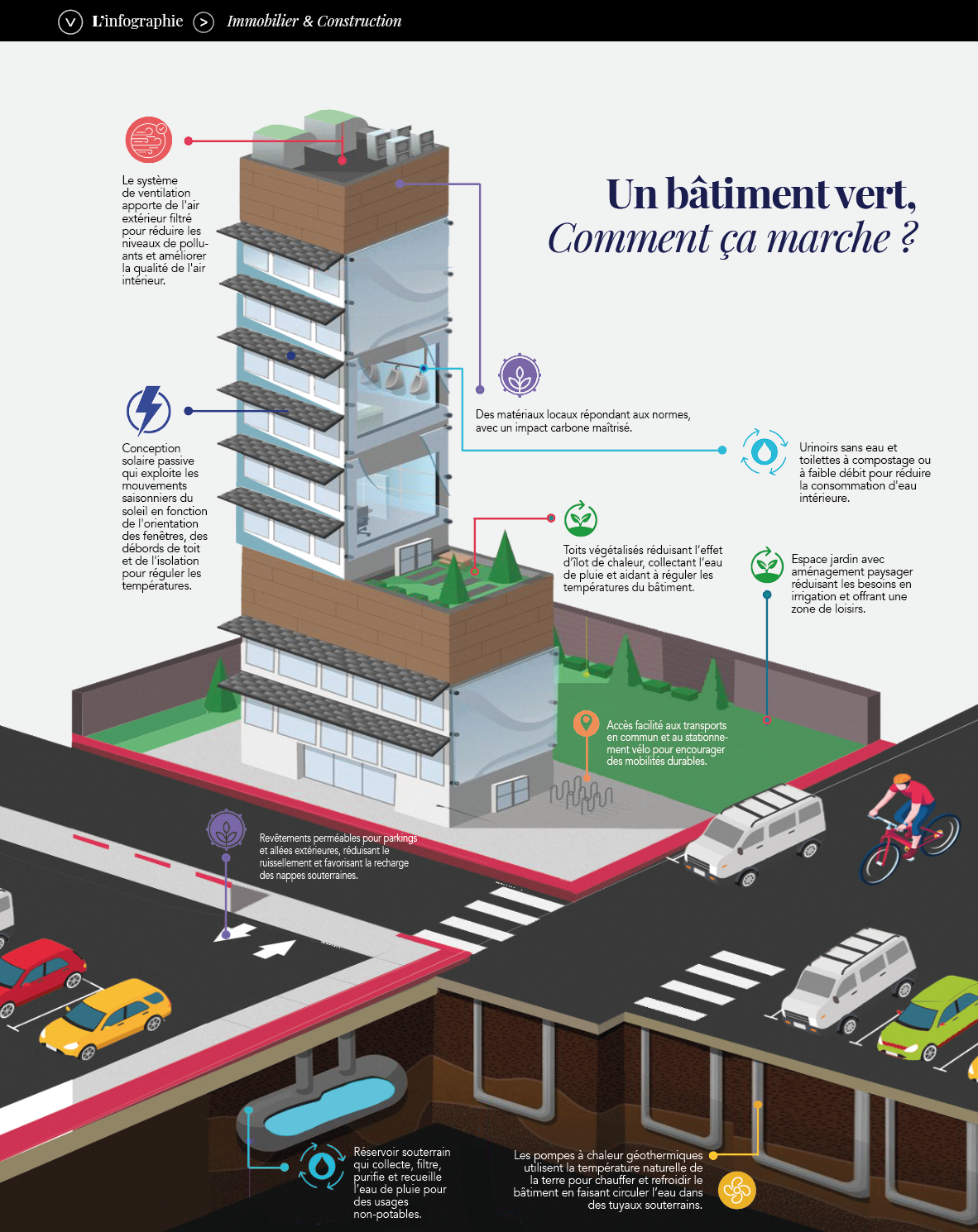 L’infographie met en lumière les innovations qui façonnent les bâtiments de demain : toits végétalisés, ventilation optimisée, toilettes sans eau, matériaux à faibles émissions et conception solaire performante. Géothermie, récupération des eaux pluviales, espaces verts et mobilité durable complètent une approche intégrée, pensée pour réduire l’empreinte carbone.